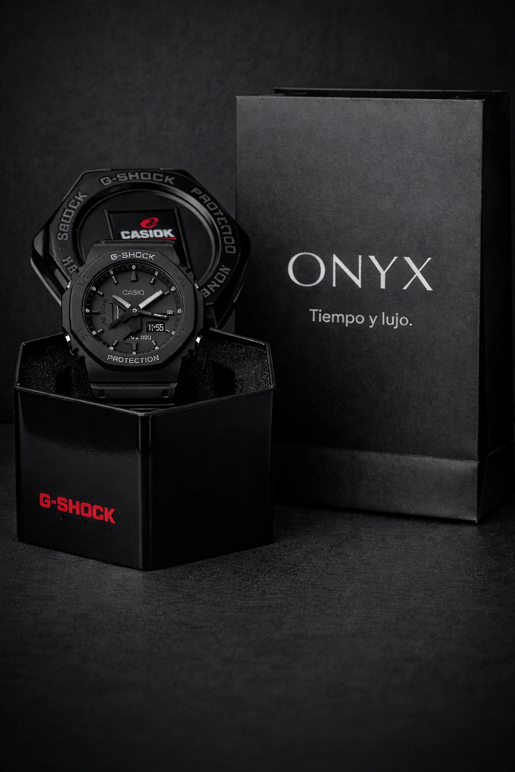 El Nuevo Reloj Onyx tiene un diseño totalmente negro, moderno y monocromático, que transmite elegancia, minimalismo y un estilo único que destaca en cualquier ocasión.